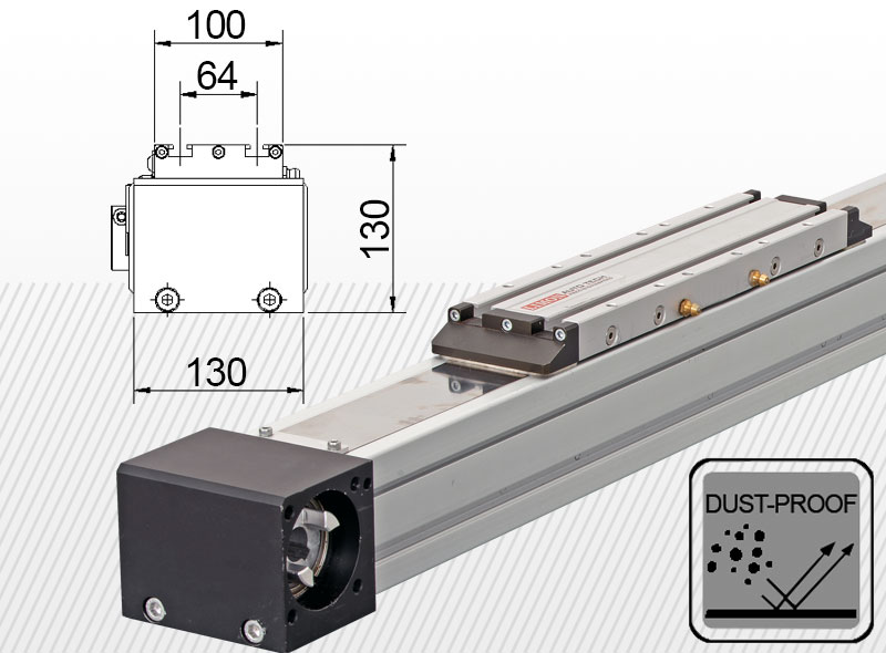 Lineárna jednotka ITC 100L je pohon s ozubeným remeňom a ochranným systémom proti znečisteniam. Lineárna jednotka je vybavená ozubeným remeňom s profilom HTD-8M a jemnou vrstvou zníženia hluku na povrchu zubov. Ak je pre Vás dôležitý minimálny hluk, prosím vyberte si túto možnosť v možnostiach v nižšie uvedenom konfigurátore. V tomto prípade budeme používať špeciálne vedenie a ozubený remeň. Vďaka tejto konštrukcie bude lineárna jednotka asi o 30 - 40% tichšia.