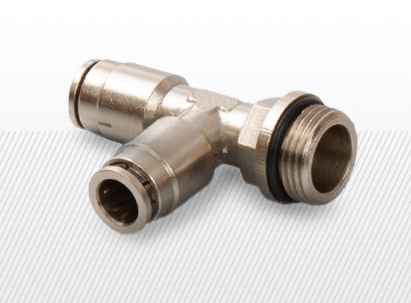 Pneumatický spojka T-tvar s vonkajším závitom BSP na jednej strane, ponyklovaná medená spojka. Výrobky sú dostupné zo skladu v rôznych veľkostiach.