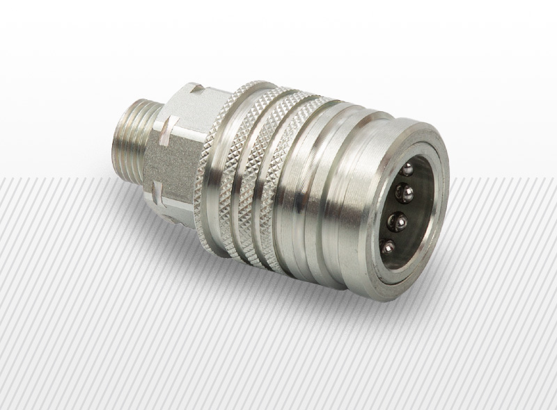 Hydraulická kolíková push-pull rýchlospojka DTE DH2 z ocele s kužeľovým metrickým závitom. Certifikácia podľa ISO 7241-1A, kompatibilná s výrobkami rôznych výrobcov v rámci štandardu.