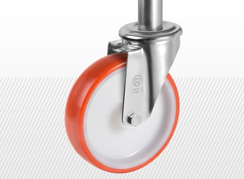 Koleso s polyuretánovým behúňom a nábojom "Polyamid 6", s klzným, valčekovým resp. nerezovým ihlovým ložiskom. Behúň (55 +/-3 Shore) má výborný valivý odpor, veľkú pružnosť, vysokú oderuvzdornosť a pevnosť v ťaho. Lisované vidlice môžu byť vyrábané z pozinkovanej (NL) a nerezovej ocele (NLX).